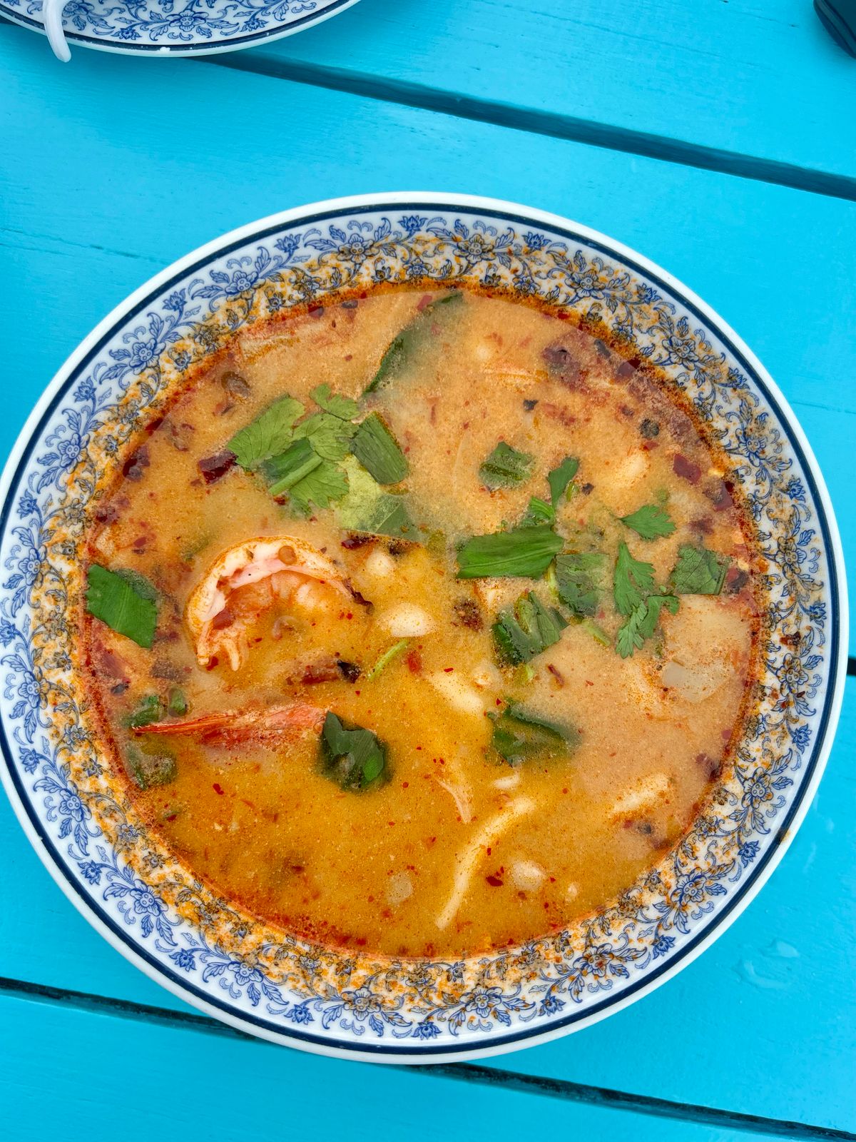 Creamy, coconut milk-based, to be eaten with steamed rice. Alongside it, we had Tom Yum Gai — the spicy Thai soup, this version with shrimp and a creamy broth. The soup came in two styles: a clear broth or a creamy one. We had chosen creamy. When ordering, they asked: mild, medium, or very spicy. We went for something very spicy. Still, it was not much. Naturally, we ordered steamed rice too — available in two sizes: a modest bowl, or the larger one that we picked. The Thai green chicken curry was rich and comforting. The price? Just 200 Baht — roughly 500 Indian Rupees. Enough for two, maybe even three. The soup? 220 Baht, and from that one bowl, we got four servings. Frankly, that was more than reasonable.